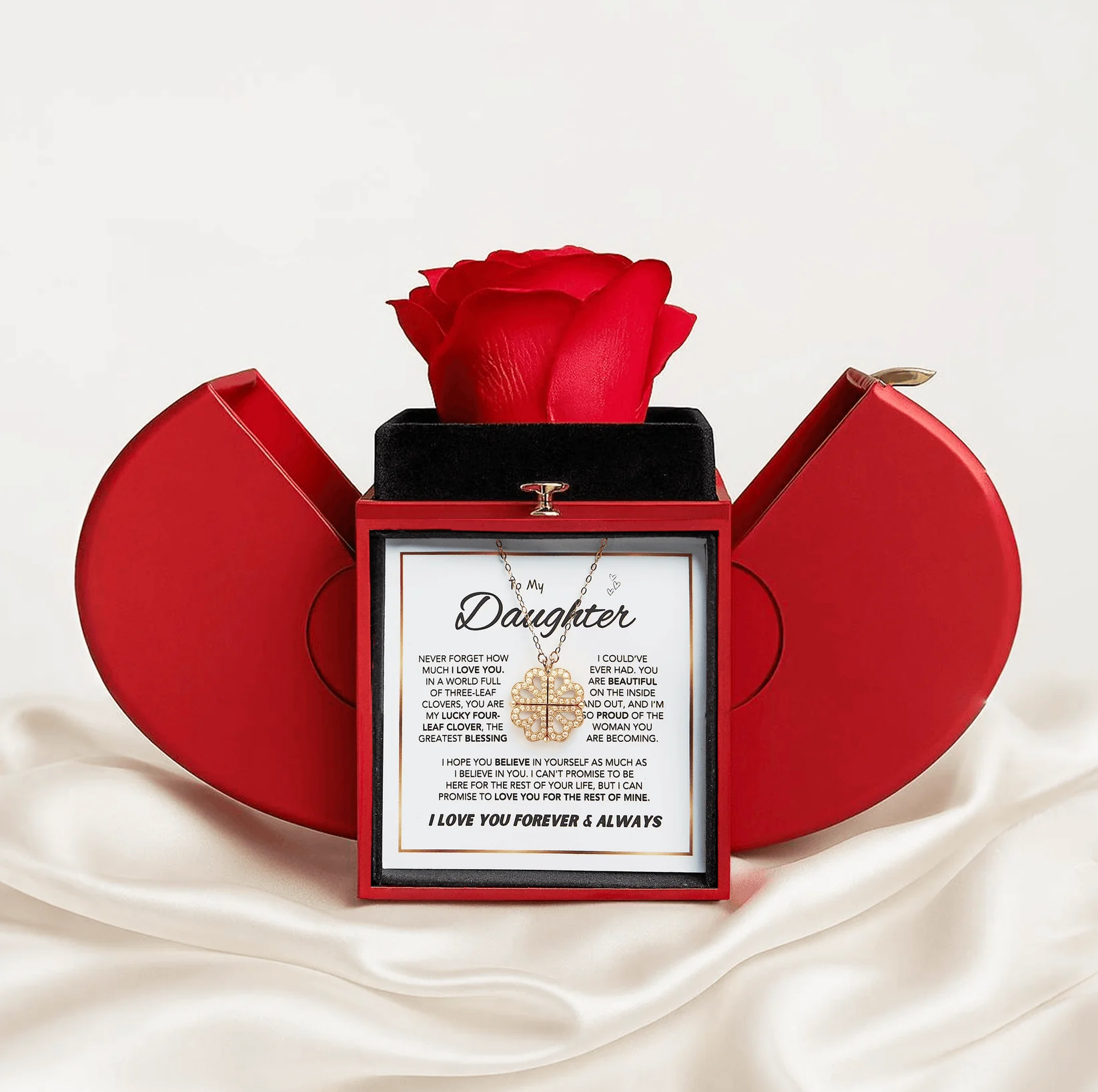 Give your daughter a timeless reminder of your love and blessings with this elegant Four-Leaf Clover Pendant Necklace. A symbol of good fortune, faith, and the unbreakable bond between a parent and child.