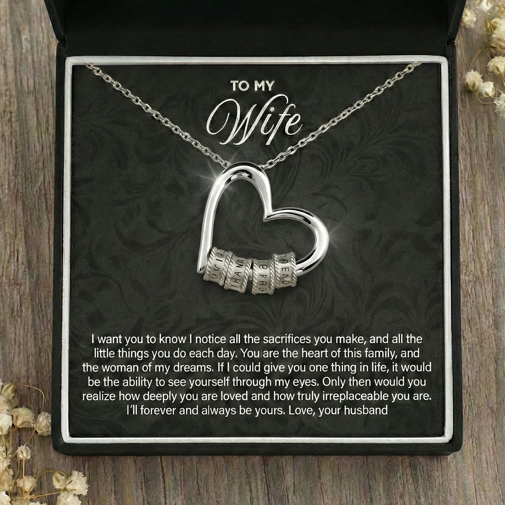 I want you to know I notice all the sacrifices you make, and all the little things you do each day. You are the heart of this family, and the woman of my dreams. I f I could give you one thing in life, it would be the ability to see yourself through my eyes. Only then would you realize how deeply you're loved and how truly irreplaceable you are. I'll forever and always be yours.